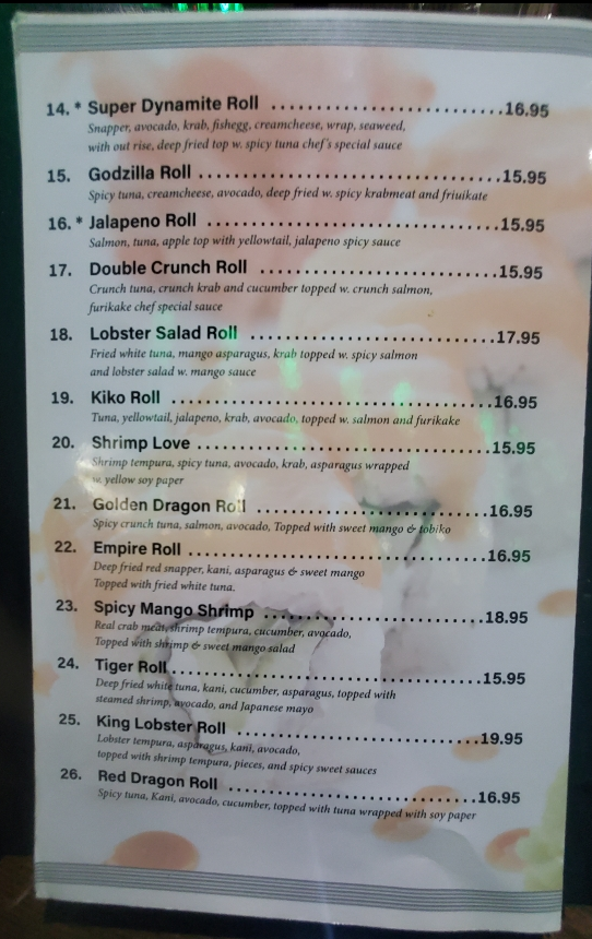 Shrimp tempura,asparagus,cream cheese,top with tuna ,salmon, yellowtail,krab meat,and wasabi sauce